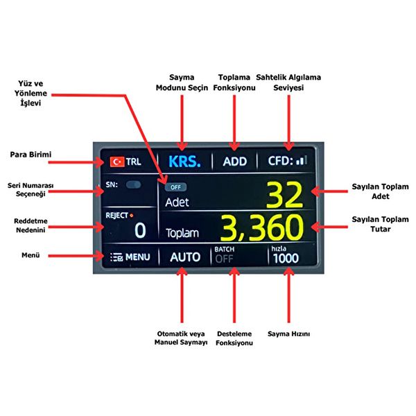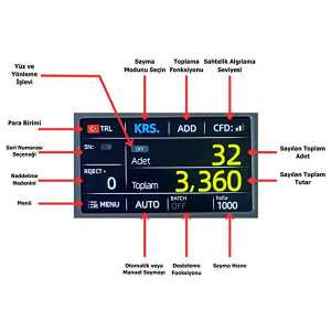kullanıcı dostu, geniş renkli dokunmatik ekranı sayesinde, bütün işlemler tek ekran üzerinde kolaylıkla yapılabilmektedir. karışık, tek cins, eski/yeni sürüm, ödeme .... gibi bütün sayım modlarını aynı ekranda göstermektedir. bu şekilde kullanıcı dilediği sayım modunu, ekrana dokunarak rahatça seçebilmektedir.